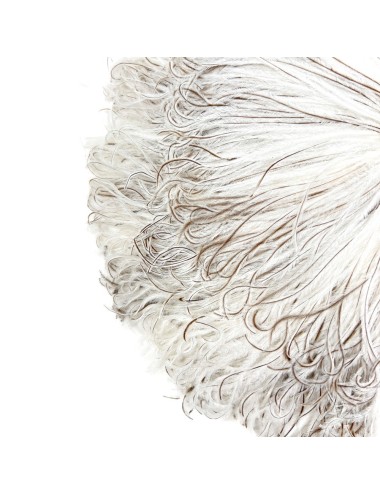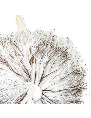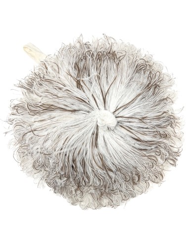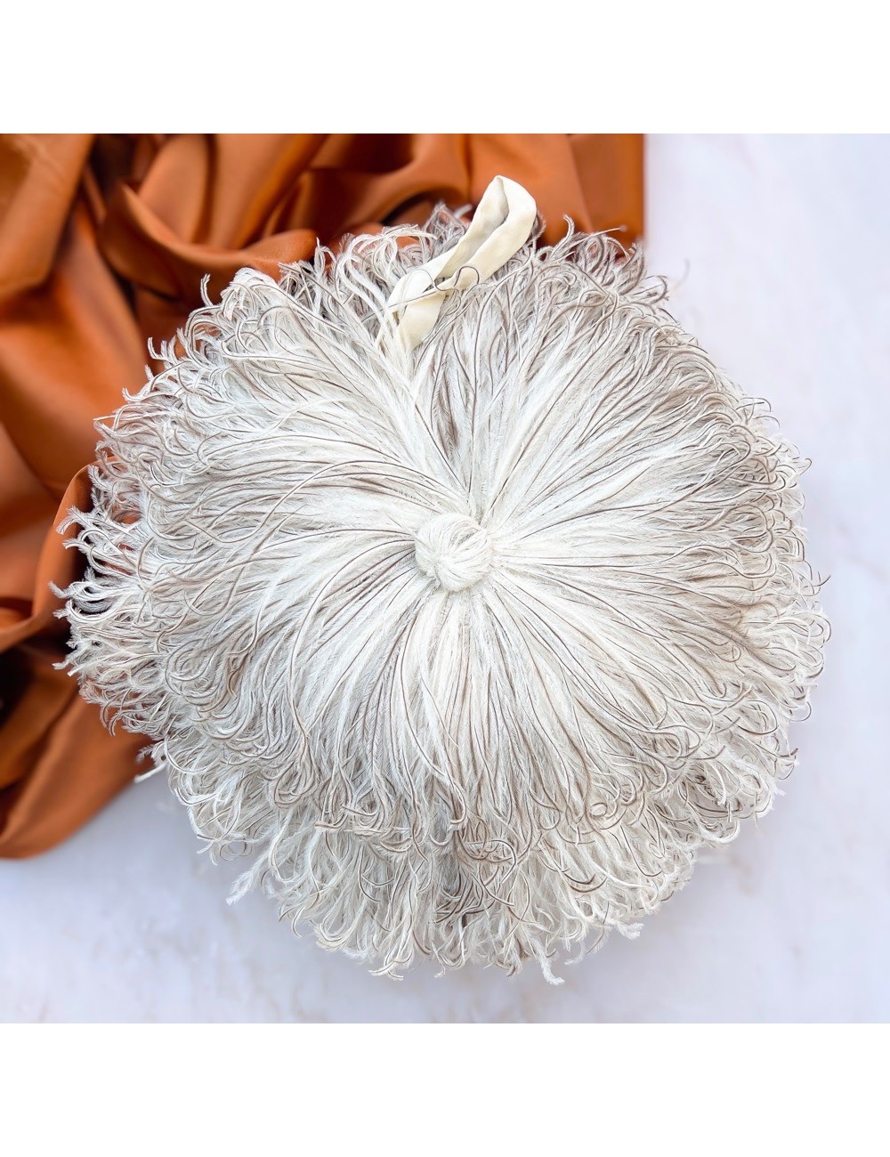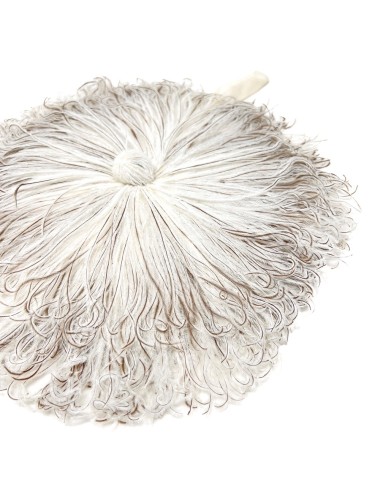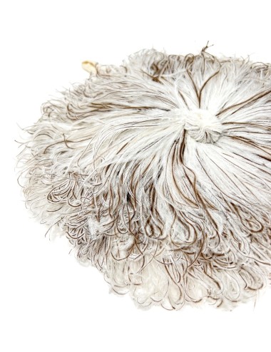 This wonderful bag is constructed from ostrich feathers assembled into circles and stitched to fabric. The ends of the feathers are bound together at the centre of the circles to form a decorative knot. The bag has a single cotton fabric compartment and a short cotton fabric handle. The bag measures 29cm in diameter. The drop of the handle is 14cm.