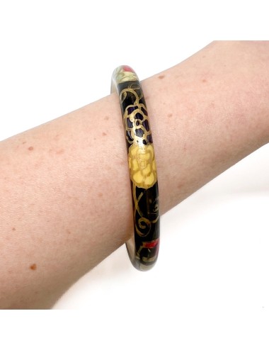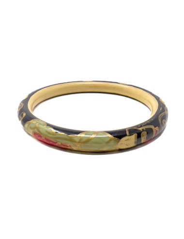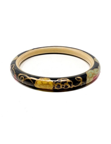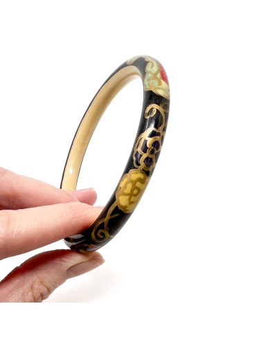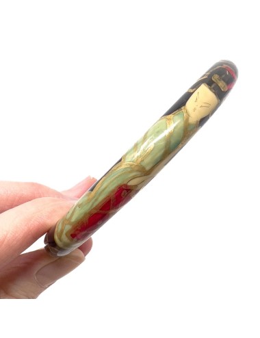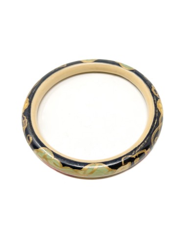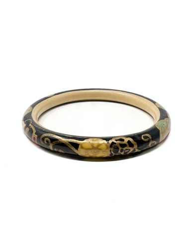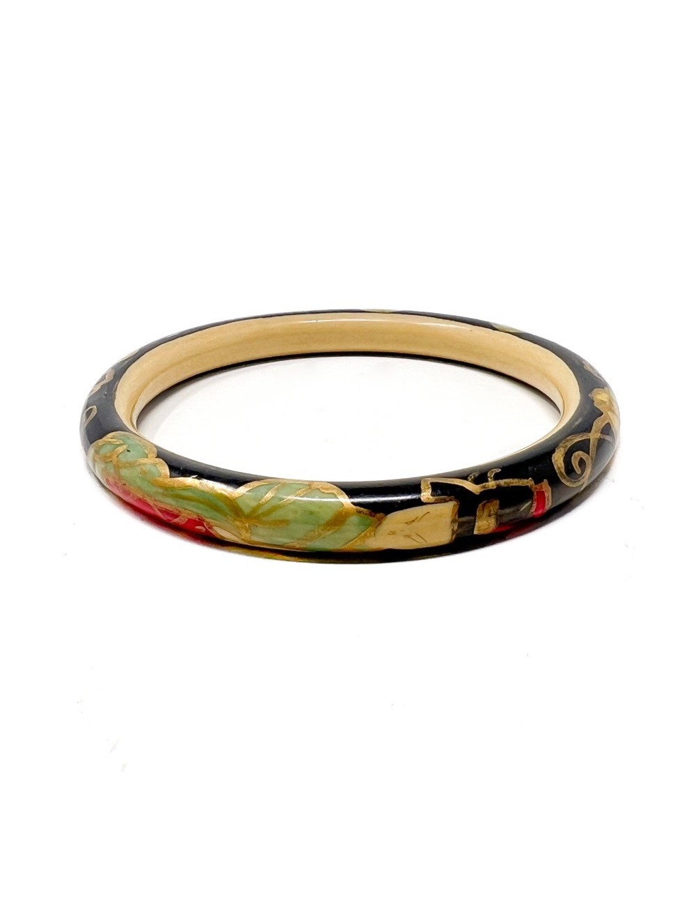 This bangle is constructed from cream coloured celluloid - known as ivorine celluloid. It is hand painted with East Asian inspired people and flowers. The internal diameter the bangle is 7cm making the internal circumference 21.9cm.