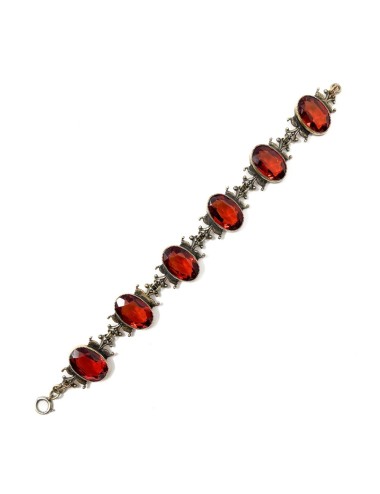 This bracelet is constructed from gold plated metal. It features scrolling filigree work and is detailed with what are most likely Hessonite Garnets. The Garnets are bezel set and faceted. The bracelet fastens with a bolt ring and measures 17cm in length.