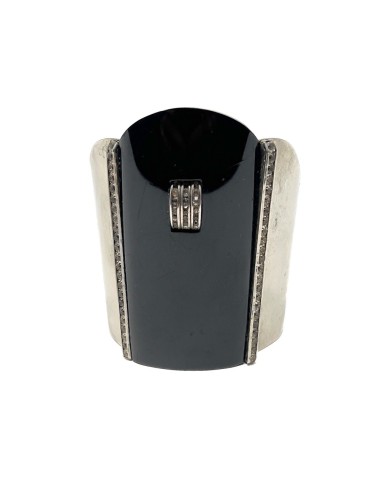 This cuff is constructed from chrome plated metal. It features a large panel of black Galalith and is detailed with channel set, round, colourless paste stones. The cuff is hinged. It is stamped on the inside with the German patent mark D.R.G.M. and a patent number. The internal circumference of the cuff is approximately 17cm.