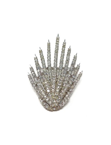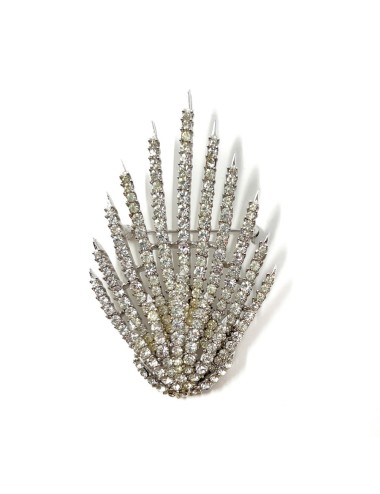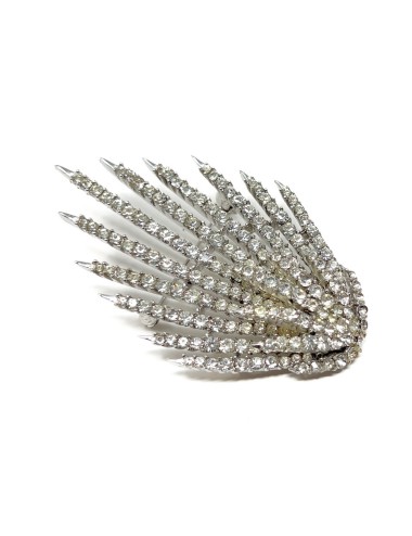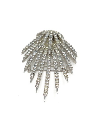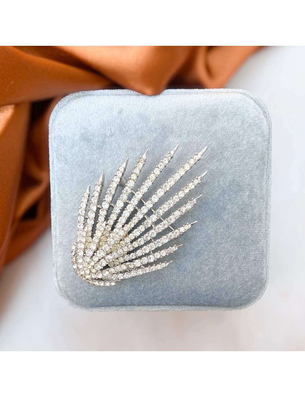 This rhodium plated metal brooch features a shooting star, comet or firework inspired design and is past of the brand's 1966 'Starflight' collection. It is set with round, colourless rhinestones. The brooch fastens with a traditional safety catch and the fastening pin is attached to the brooch with a round hinge. The brooch is stamped 'TRIFARI' with a crown above the 'T' and a copyright symbol. The brooch also has a bail, so that it may be worn as a pendant too. The piece measures 7cm x 4.25cm.