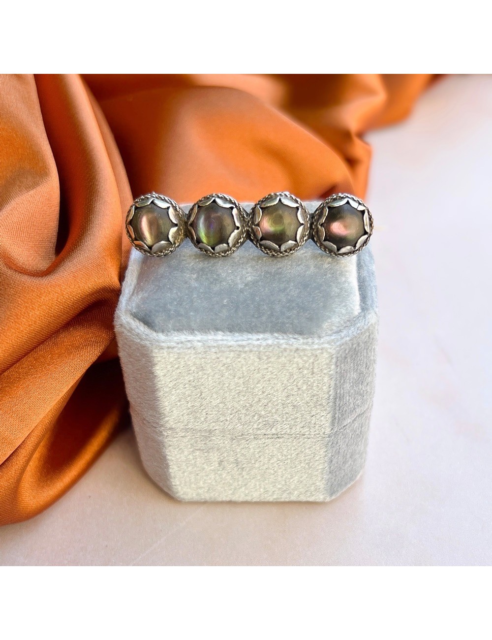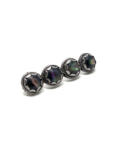 Translated from the French 'pearl shell', Coque de Perle was a form of faux pearl predominantly used in Georgian jewellery carved from the East Indian nautilus shell. It was highly prized and popular because of its iridescence and could be found from light white shades through to dark greys and black, as can be seen in this example.