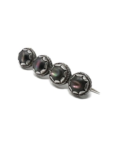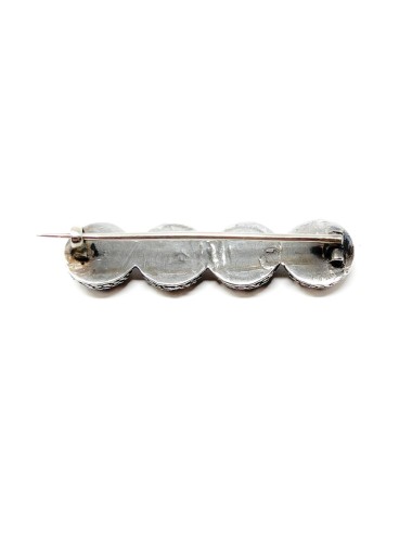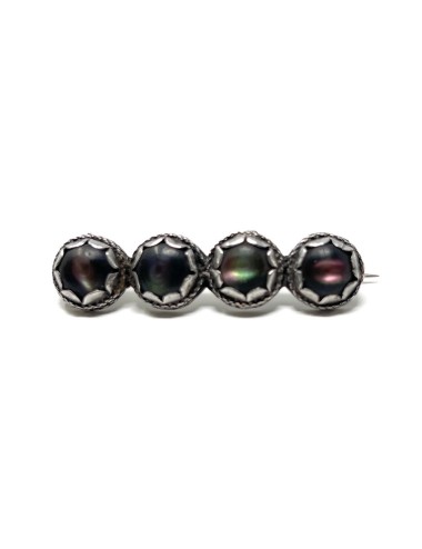 This brooch was made in the Georgian era, dating to around c.1800. It features four round Coque de Perle cabochons claw set within a silver mount. Although un-hallmarked, the mount tests as silver. The brooch fastens with a 'C' clasp and the fastening pin is attached to the brooch with a tube hinge. The brooch measures 4.5cm x 1cm.