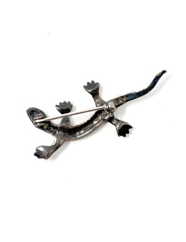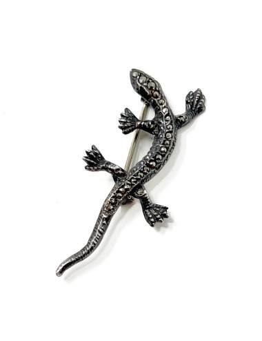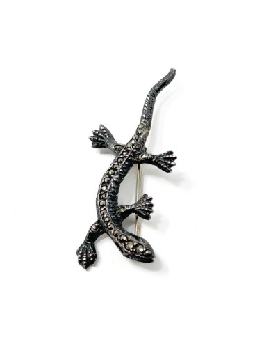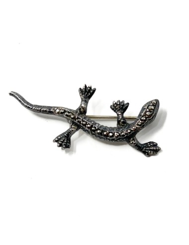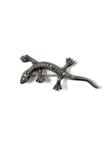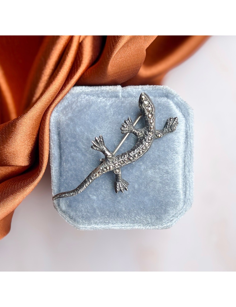 This brooch is constructed from silver - it is stamped 'SILVER' on the reverse. The brooch features a lizardmotif and it is set with small, round Marcasite stones. The brooch fastens using a traditional safety catch and the fastening pin is fitted to the reverse of the brooch with a round hinge. The brooch measures 4cm x 2cm.