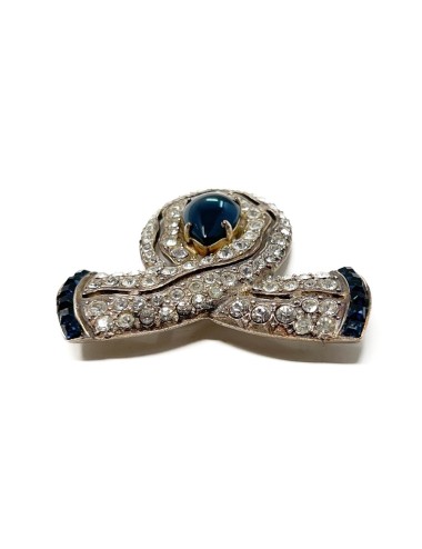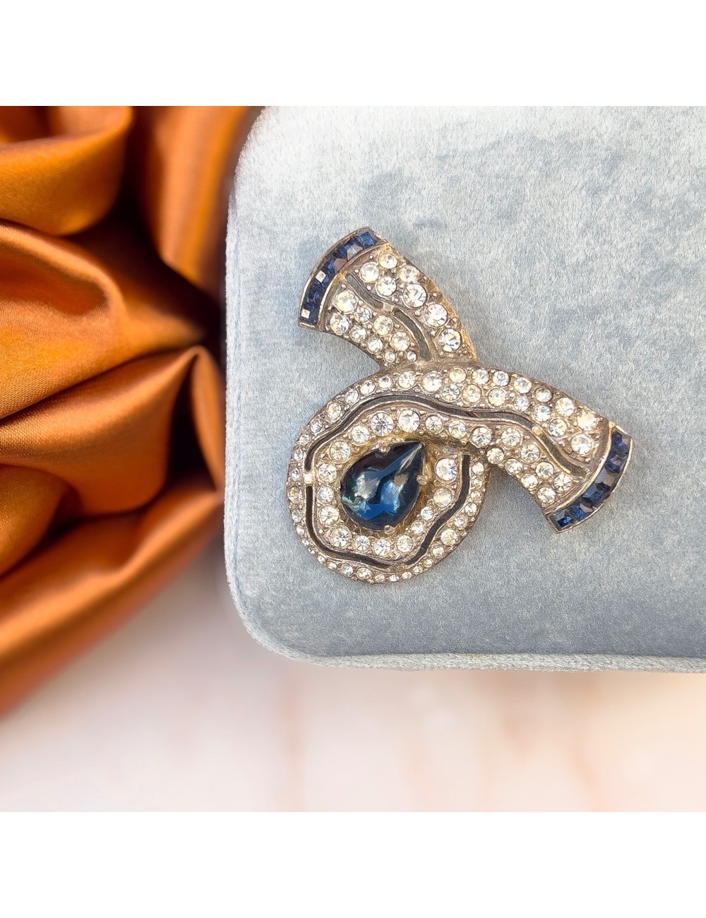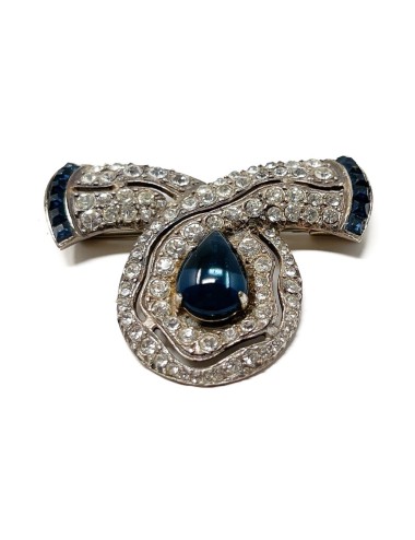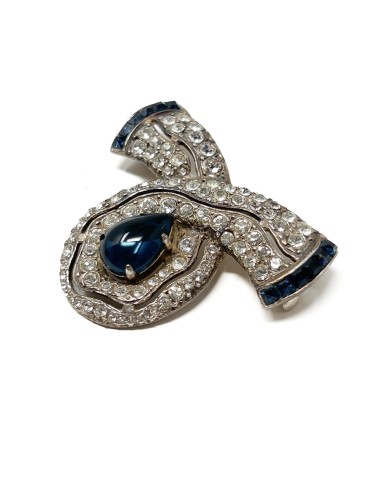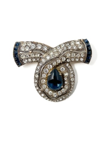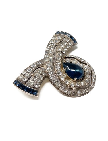 This brooch is constructed from silver tone metal and features a knot-like design. The brooch is set with round, colourless paste stones and square cut, sapphire blue paste stones. At the centre of the brooch is a pear cut, sapphire coloured glass cabochon, which is claw set. The brooch fastens with a trombone catch and the fastening pin is attached to the brooch with a round hinge. The brooch measures 5cm x 4cm. Although unsigned, this brooch can be attributed to René Mittler as it was sourced from a dead stock collection of his pieces sold by an expert in Paris.