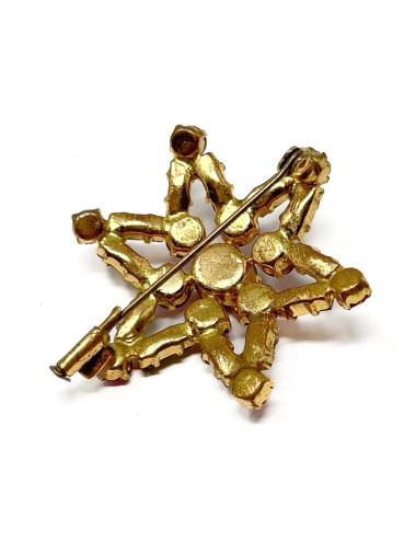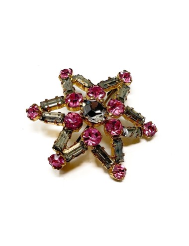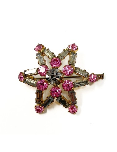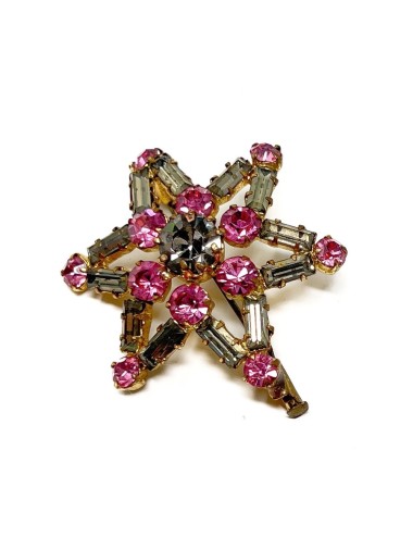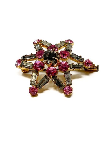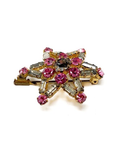 This gilded metal brooch features a star motif. It is detailed with faceted and claw set, round and baguette cut pink and grey rhinestones. The brooch fastens with a trombone clasp - commonly found on jewellery made in France - and the fastening pin attaches to the brooch with a round hinge. The brooch measures 4cm x 3.5cm.