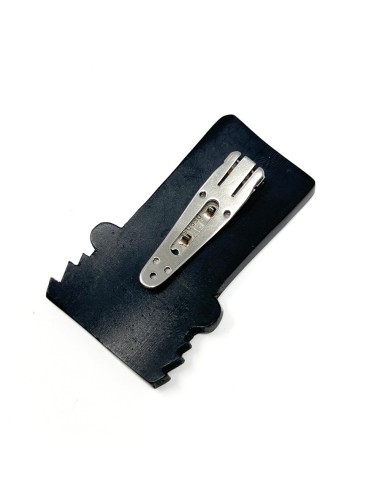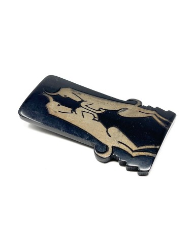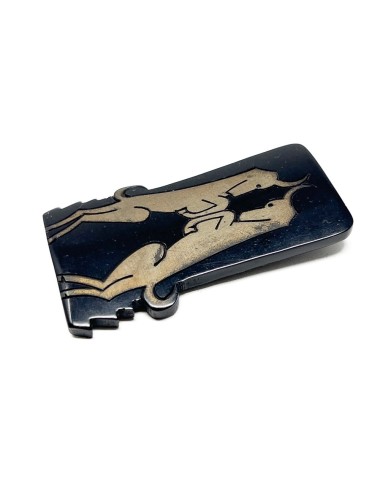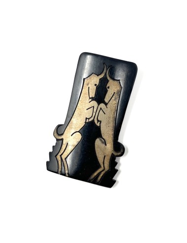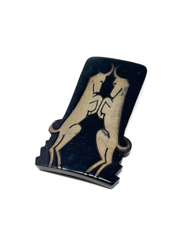 This dress clip is constructed from black celluloid. It features a design of two gilded Gazelles. The dress clip measures 5.5cm x 3.5cm. The clip is stamped 'DELCIA DÉPOSÉ' - a French patent mark.