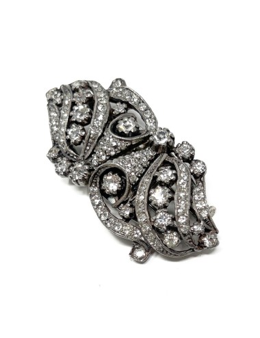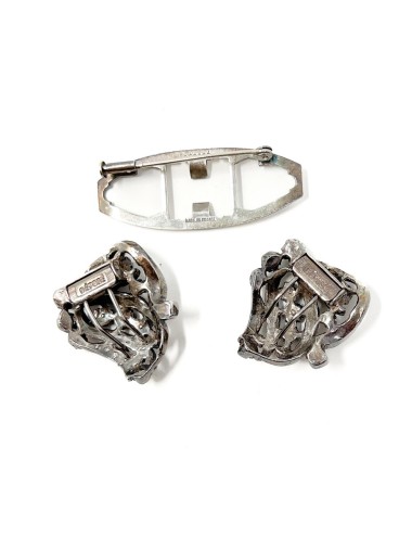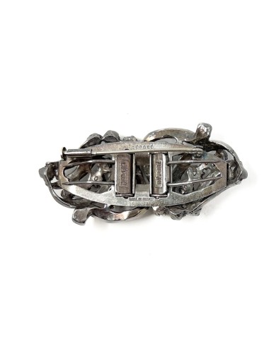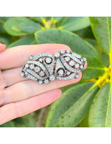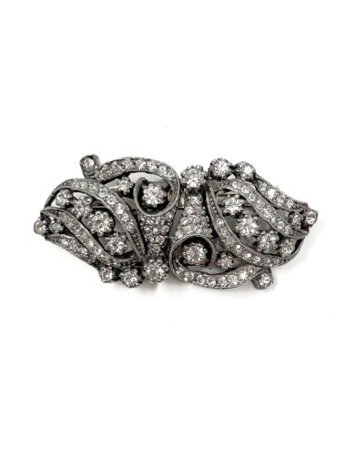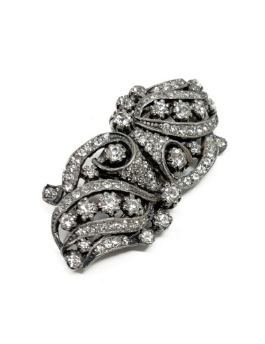 This Duette clip brooch is made from silver tone metal. It is set with round, faceted, colourless paste stones. The brooch mechanism fastens with a trombone catch and the fastening pin attaches to the reverse of the brooch with a round hinge. The Duette brooch measures 5.5cm x 2.5cm. Each individual clip measures 2.75cm x 2.5cm. The reverse of the piece is stamped with 'DÉPOSÉ' in 3 places and 'MADE IN FRANCE'.