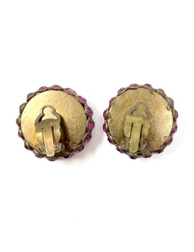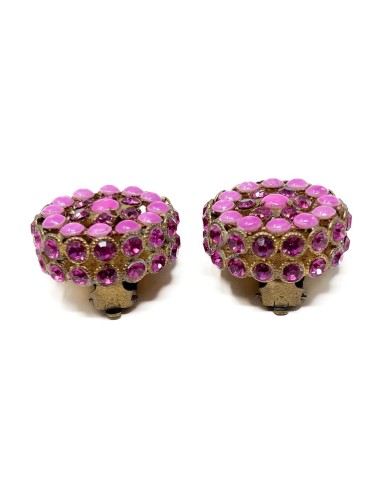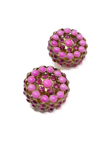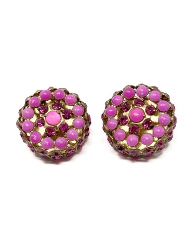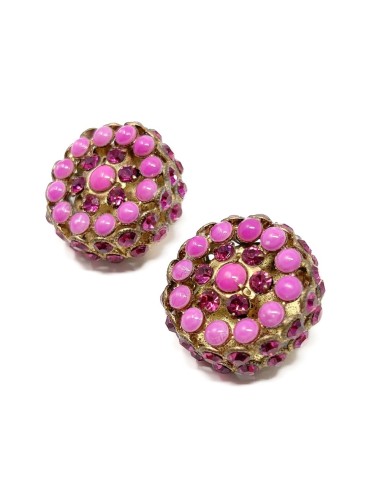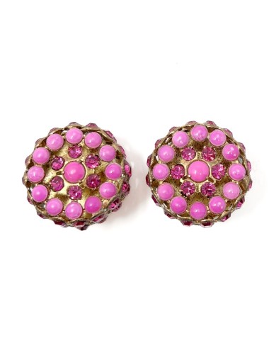 These gilded metal earrings are cylindrical in shape. They are detailed with round pink glass cabochons and round, faceted, pink rhinestones. The earrings are clip on. Each earring measures 2.5cm in diameter.