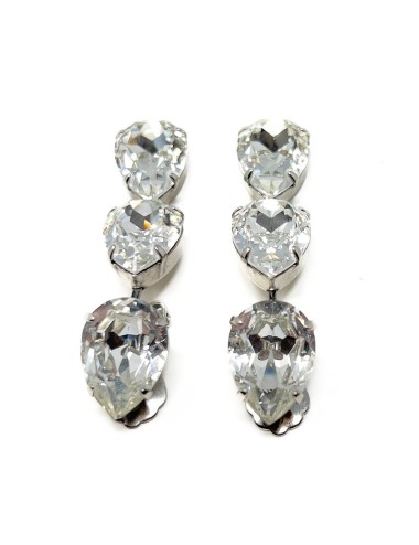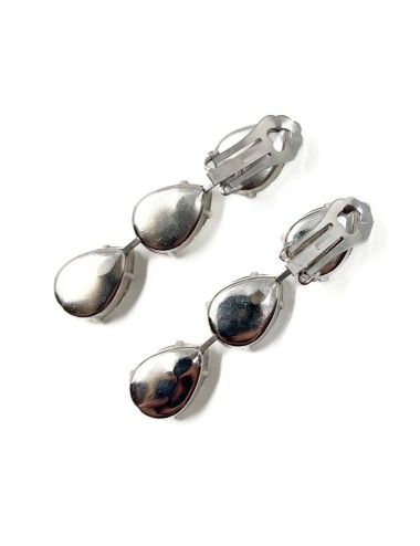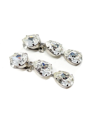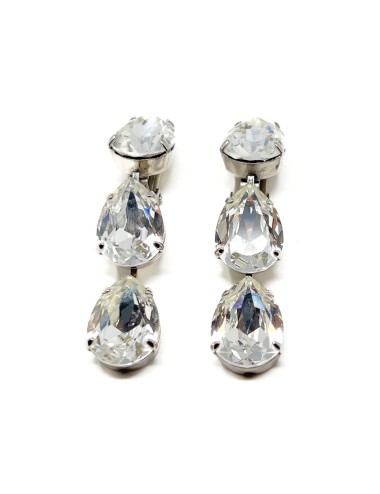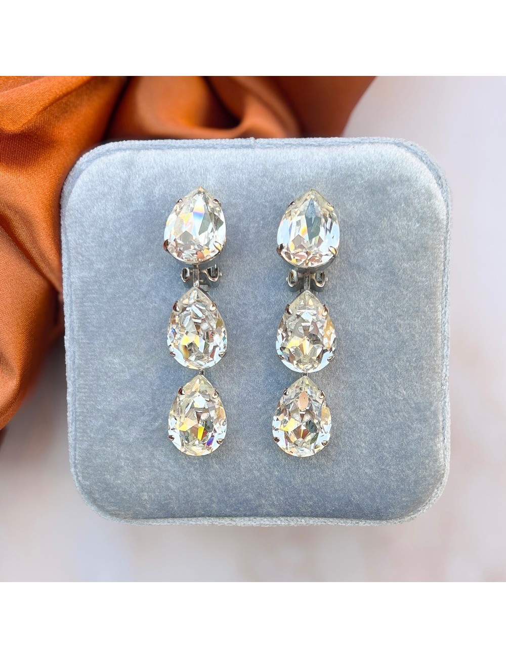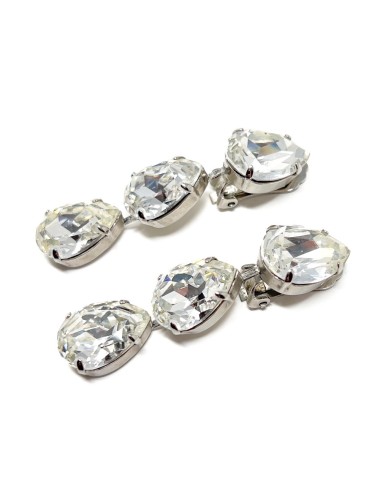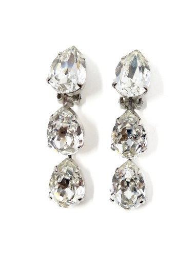 These rhodium plated metal earrings feature a drop design comprised of three, large, faceted, claw set, colourless pear cut rhinestones. They are clip on and measure 5.5cm x 1.25cm.