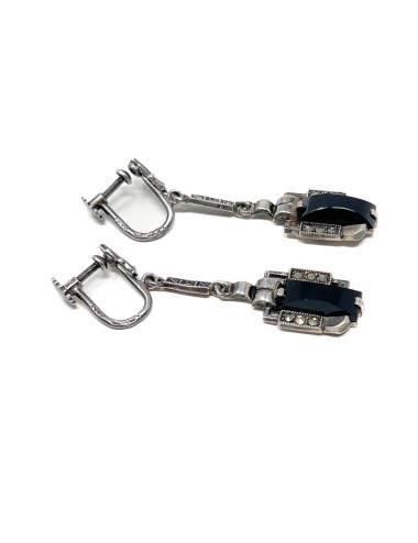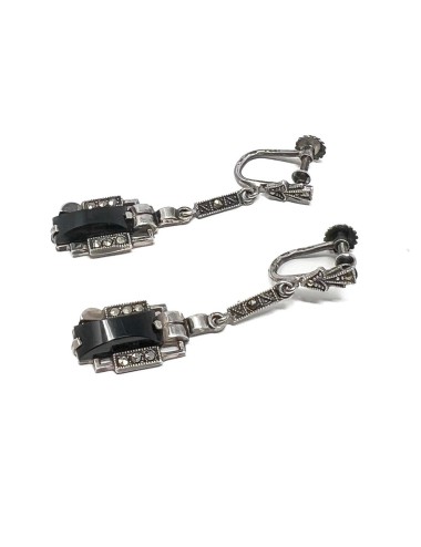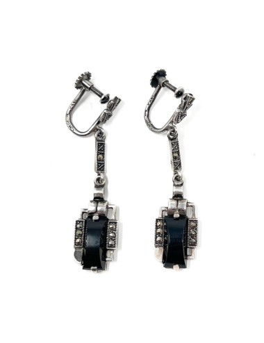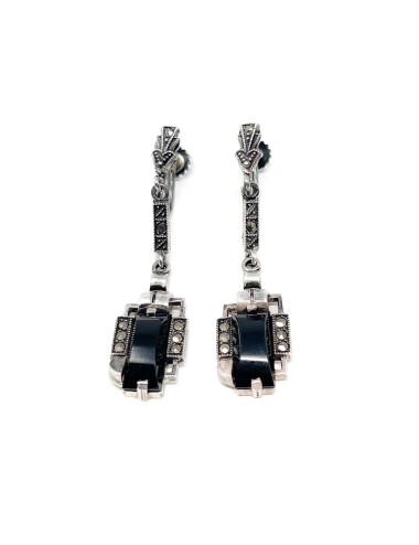 These earrings are constructed from silver - they are stamped '935' on their reverse. They are also stamped with a makers mark. This is difficult to decipher, but appears to read 'LMC'. They were most likely made in Germany. The earrings feature a drop design and are detailed with Marcasite stones. They are also detailed with a claw set, faceted Onyx panel. The earrings secure to the ear with screw backs. The earrings measure 4cm x 1cm.