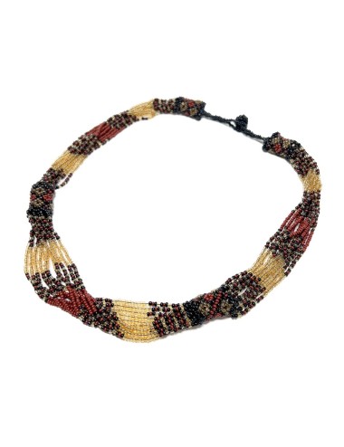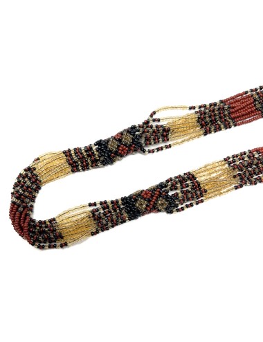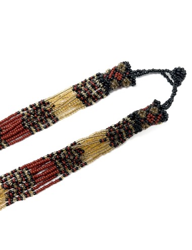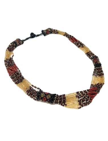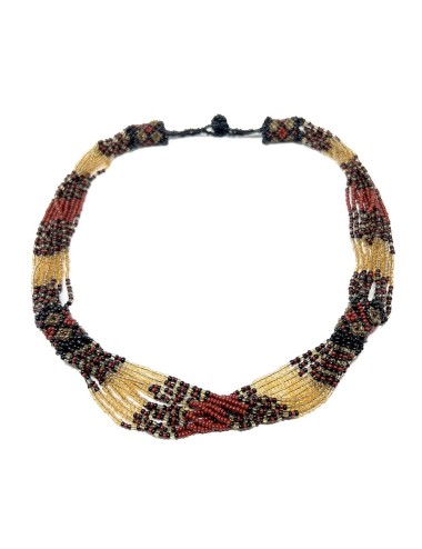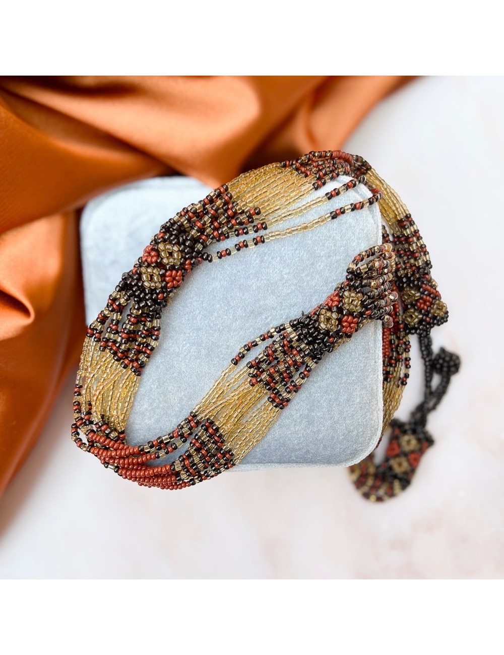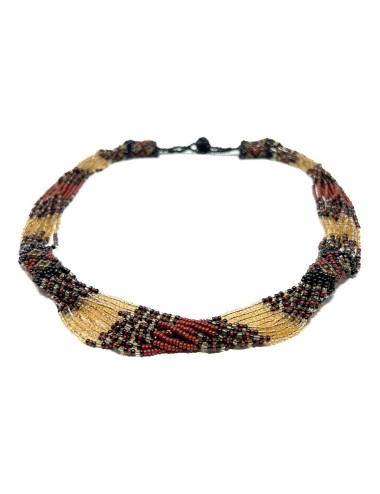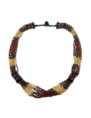 This necklace is constructed from strands of gold, black and brown micro beads woven into geometric patterns. The necklace fastens with a toggle clasp. It is adjustable in length with two holes to fasten through. The necklace measures 53cm at its longest length.