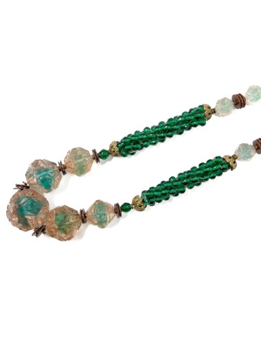 Threaded onto silk thread, this necklace features round a faceted emerald green glass beads and carved and faceted Uranium glass beads of varying sizes. The Uranium glass beads have a two-tone pale pink and green colour in daylight. But, under a UV light green glows neon. The beads are also interspersed with decorative brass disc spacers and gilded metal cappings. The necklace fastens with a barrel clasp and measures 49cm in length.