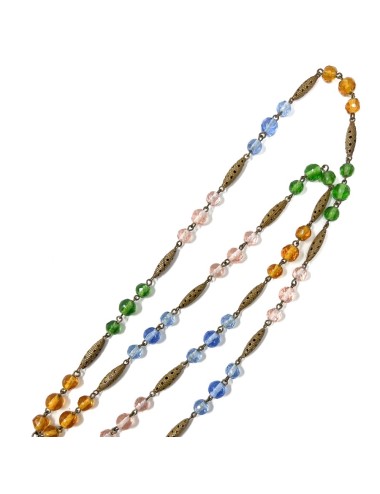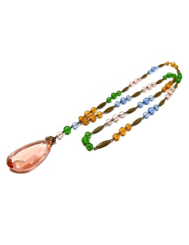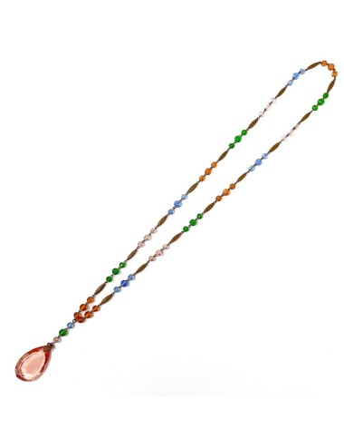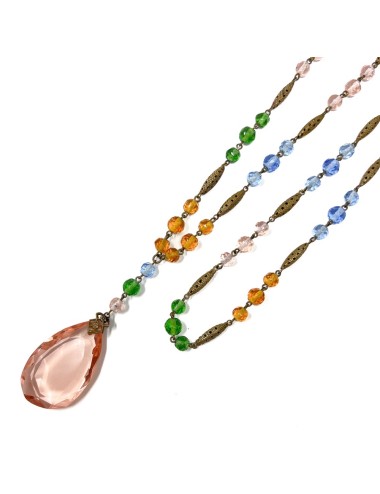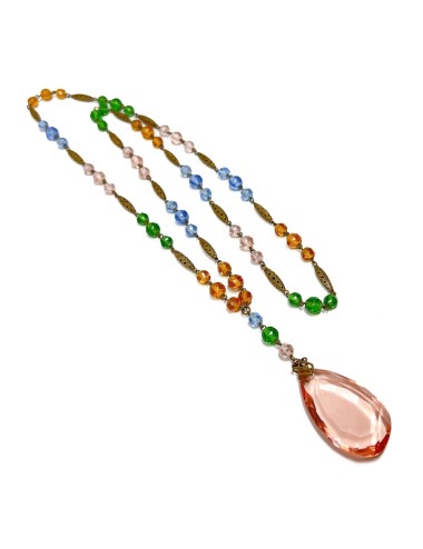 This necklace features gilded metal bicone beads. Along its length, in sets of 3, are faceted round glass beads in shades of pink, green and blue. Suspended from the necklace, from a gilded metal filigree capping, is a faceted, teardrop shaped, pink glass pendant. The necklace measures 70cm in length and the pendant has a drop of 7cm. The pendant is 2.5cm wide.