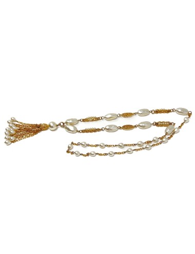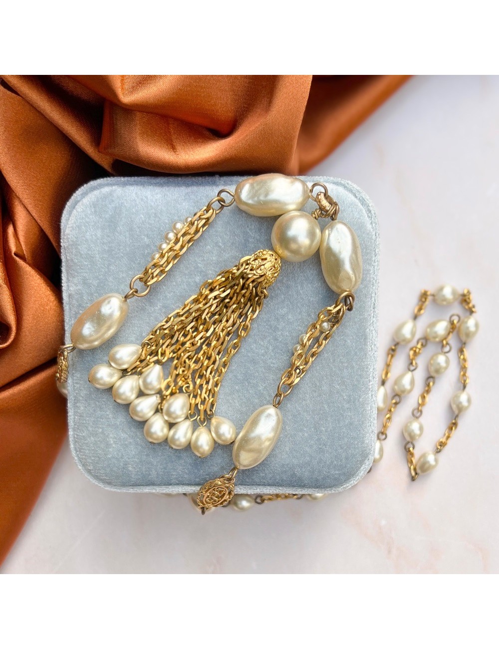 1960s Gold Plate and Faux Baroque Pearl Vintage Tasseled Sautoir Necklace