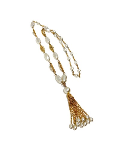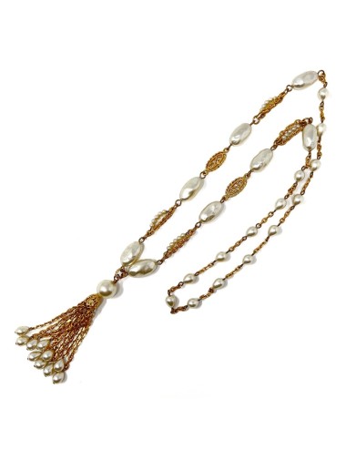 This sautoir necklace features gold plated chain and gold plated open-work design panels. It features an array of faux round and baroque pearls. Suspended from the sautoir is a gold plated filigree capping and gold plated chains attached to which are faux teardrop pearls. The necklace is 74cm in length and the drop of the tassels is 8cm.