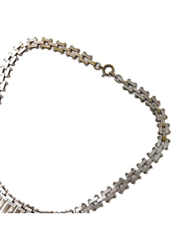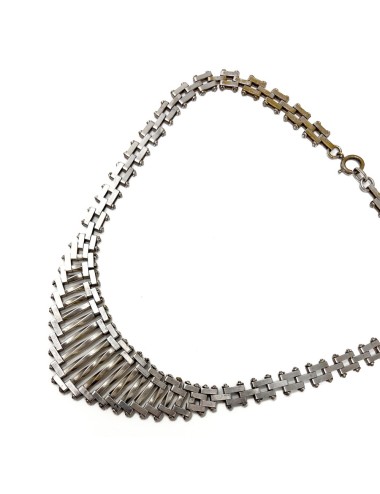 This necklace is constructed from chrome plated metal. It features rectangular panels linked together forming a brickwork or 'mauerwerk' design, which is typically found in the jewellery of Jakob Bengel. The twisted bars detailing the centre of the necklace are an unusual touch. The necklace fastens with a bolt ring and measures 39cm in length.